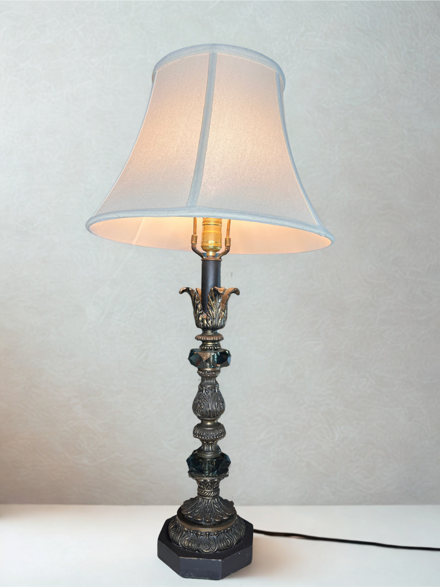 Timeless and elegant, this vintage-style lamp showcases a richly detailed bronze-finished base with carved accents and two large faceted smoky crystals for a regal touch. The bell-shaped cream shade adds warmth, making it a perfect piece for traditional interiors, reading corners, or refined entryways.