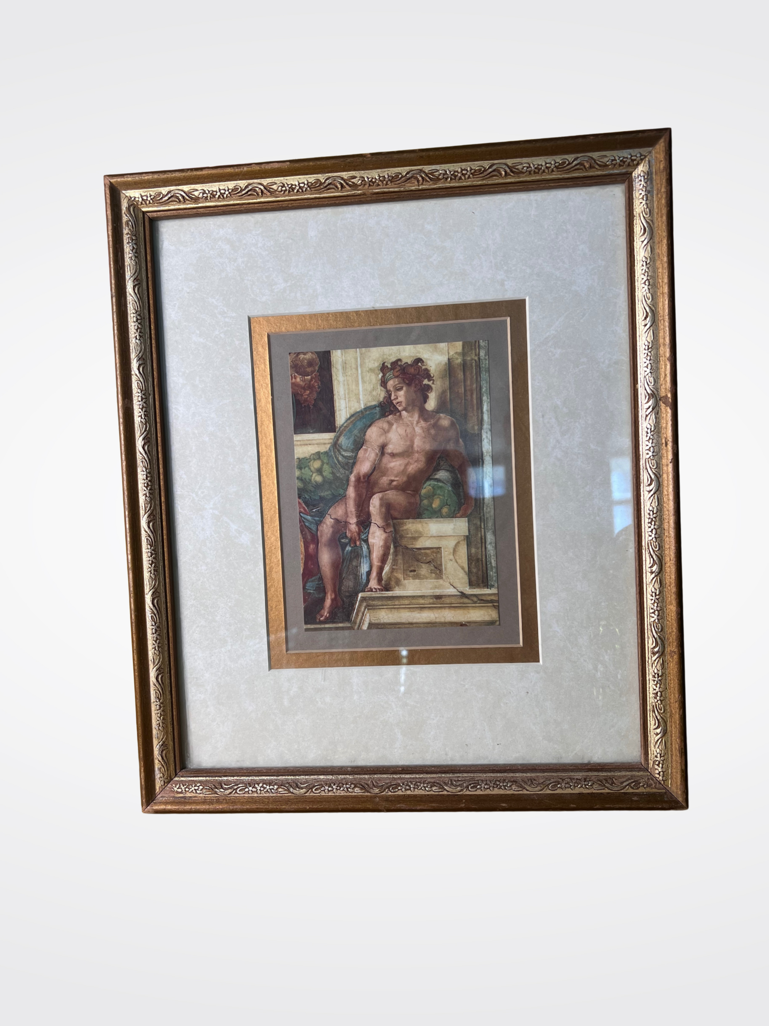 This elegant framed art print reproduces Michelangelo’s "Prophet Jonah," a fresco from the Sistine Chapel ceiling in Vatican City. Set in a refined double mat with gold accents and housed in a vintage ornate wooden frame, this piece adds a touch of timeless sophistication to any classical or European-inspired interior.