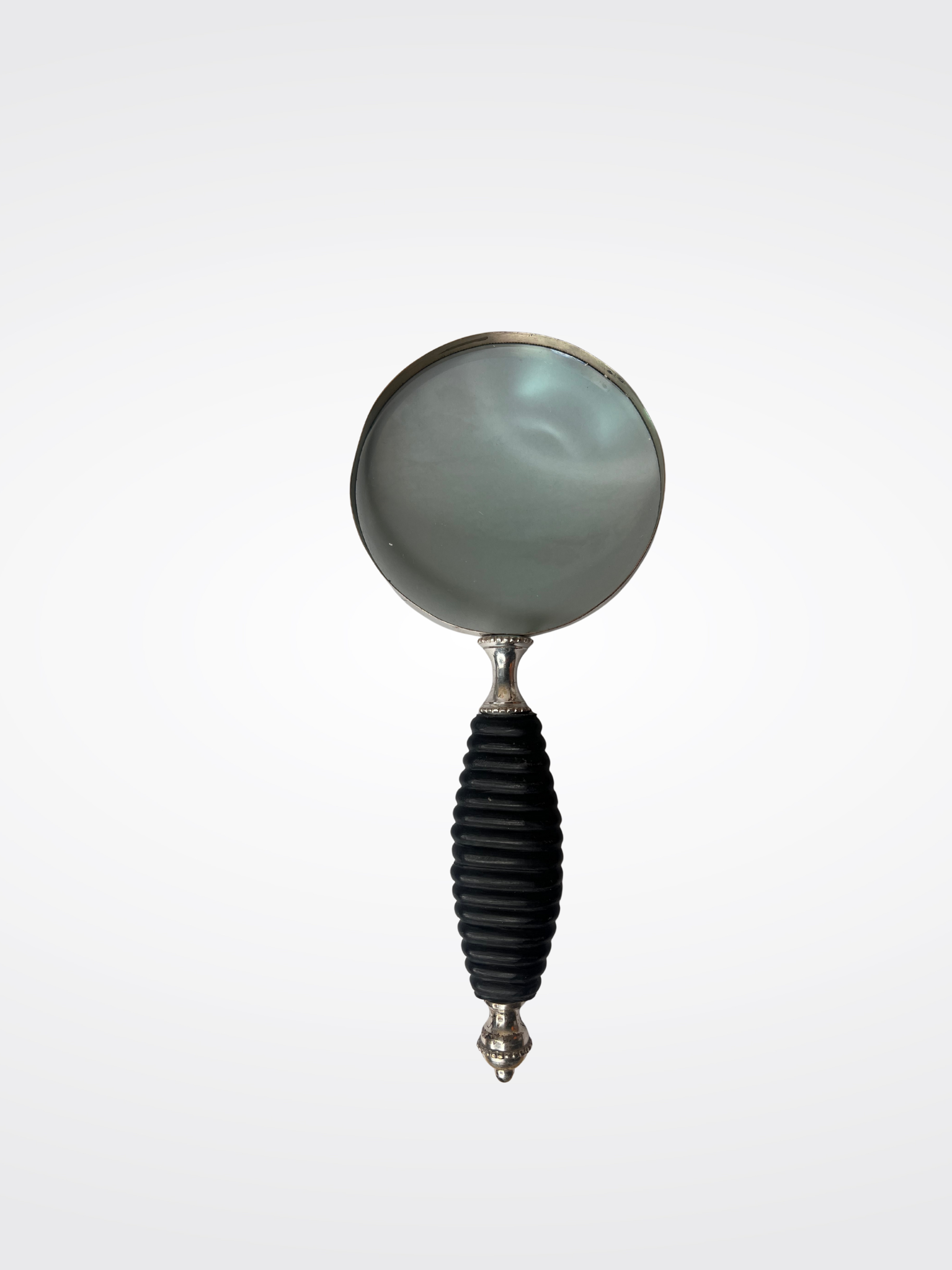 A striking desk accessory, this vintage-inspired magnifying glass combines classic functionality with a bold aesthetic. Featuring a ribbed black handle accented with ornate silver-toned metal details, it’s both a practical tool and a decorative object. Perfect for a curated office, library, or collector’s display.